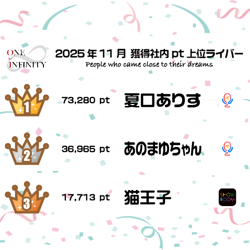 2025年11月の社内pt獲得上位ライバーは、夏口ありす、あのまゆちゃん、猫王子という結果でした。